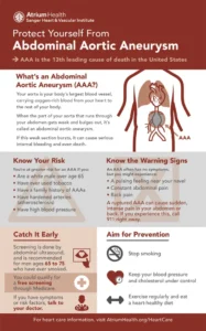 • Abdominal Aortic Aneurysm (AAA): Occurs in the section of the aorta that runs through the abdomen