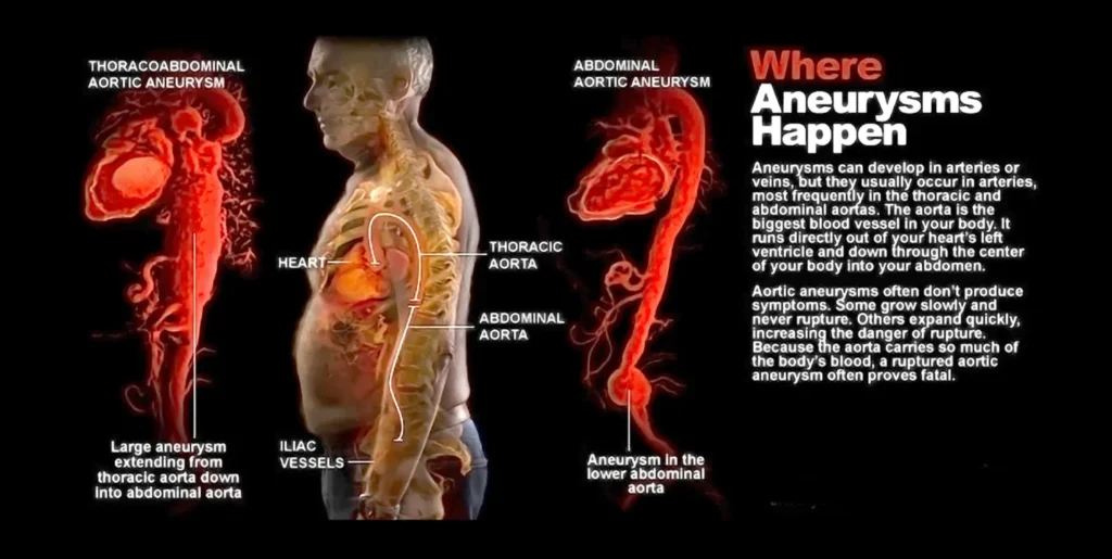 An aortic aneurysm is a weakened, ballooned section of the aorta—the body’s largest artery, responsible for carrying blood from the heart to the rest of the body. Over time, this bulge can grow and may eventually rupture, leading to a life-threatening emergency. Unfortunately, most aneurysms cause no symptoms until they become large or begin to leak.