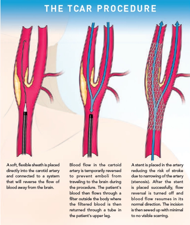 A modern, minimally invasive alternative. TCAR involves a small incision just above the collarbone, venous puncture in the groin which temporarily reverses blood flow during stenting to prevent plaque from reaching the brain.