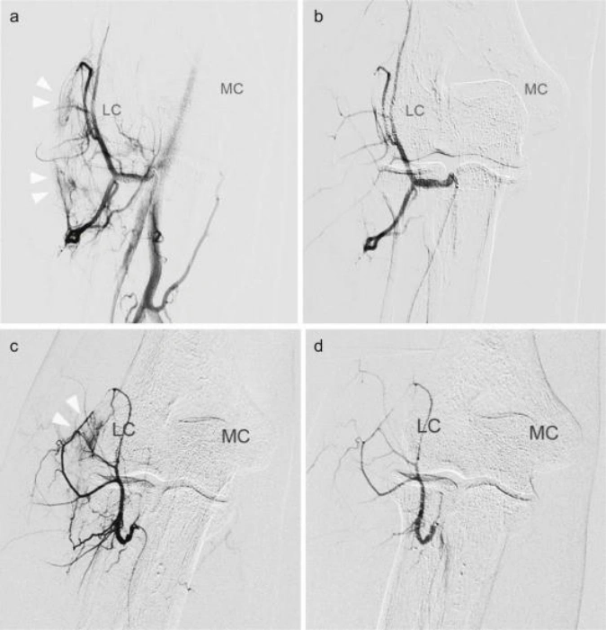 A novel option for persistent lateral epicondylitis (tennis elbow) that doesn’t respond to therapy or steroid injections. We embolize (block) the neovessels — tiny new blood vessels that grow with chronic tendon inflammation — around the elbow. By doing so, we reduce inflammation and pain, allowing the tendon to heal and restoring arm function.