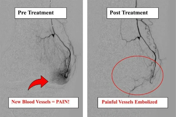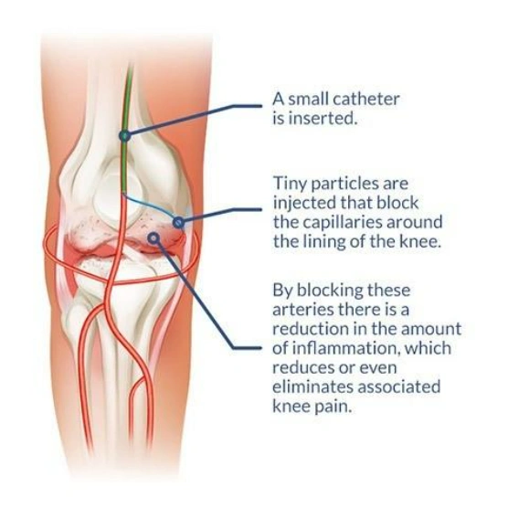 An innovative, non-surgical therapy for knee osteoarthritis pain. It works by blocking the tiny inflamed blood vessels in the lining of the knee that contribute to pain and swelling. GAE can significantly reduce knee pain and stiffness, offering relief for patients who want to postpone or avoid knee surgery.