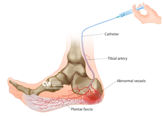 A new treatment for chronic heel pain (plantar fasciitis) that has not improved with conservative measures like rest, orthotics, or injections. This procedure targets and blocks the small abnormal blood vessels in the heel that drive chronic inflammation, providing long-term pain relief and helping patients get back on their feet without invasive surgery.