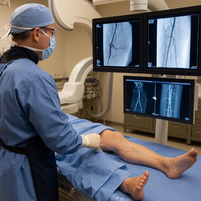 A catheter-based treatment for peripheral artery disease (poor circulation in the limbs that can cause leg pain, ulcers, or gangrene). We guide a small catheter into the blocked artery to open it and insert a stent, restoring vital blood flow to the affected leg and helping wounds heal.