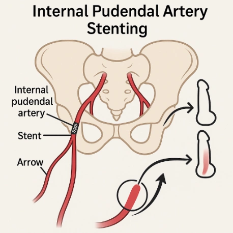 A specialized procedure for men with erectile dysfunction caused by arterial blockages in the pelvis (arteriogenic ED). A stent is placed in the internal pudendal artery (the artery supplying the penis) to improve blood flow. This can help restore erectile function in men who no longer respond to medications like Viagra or Cialis.